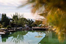 - Weitläufiges Hotelgelände mit Alpiner Gartenlandschaft