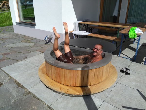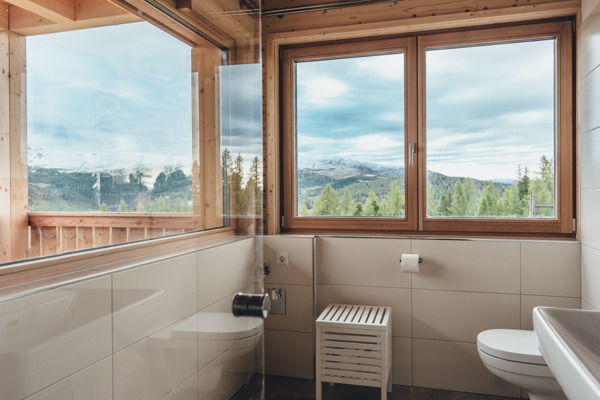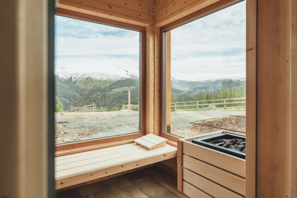 - Panorama - Sauna (Finnisch oder Bio) mit Regendusche, WC und Zirben - Ruheraum (26 m²). Außenwanne und überdachte Panorama - Terrasse (10 m²)