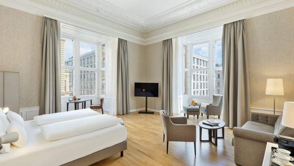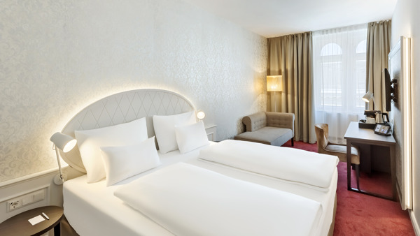 Genießen Sie den Komfort und die zeitlose Eleganz unserer 105 Gästezimmer, die durch modernste Ausstattung und hohe Funktionalität bestechen. Kostenloses WLAN und zusätzlicher LAN-Anschluss, Flatscreen-TV mit integriertem Radio und Laptop-Safe mit innenliegender Steckdose und eine Minibar ergänzen das Angebot. Das Hotel wird als Nichtraucher-Hotel geführt.