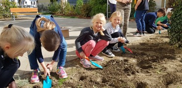 Besondere Freude bereitet uns unser neu gestalteter Pausenhof, der alle Bedürfnisse der SchülerInnen abdeckt (Ruhezonen, naturnahe Flächen, Bewegungsangebote) und auch Hochbeete und eine Bepflanzungsfläche anbietet.