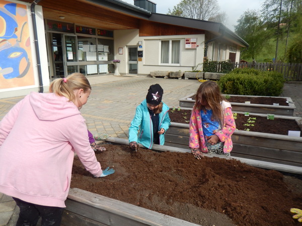 Wir haben Hinweisschilder (Licht aus, Hände waschen, richtiges Sitzen,…) besprochen und angebracht, Klassendienste (Lüfter, Stromsparer,..) eingeteilt, haben Experten (Ernährung, Müll trennen,..) eingeladen, sind den Bienenwanderweg mit Führung gegangen, haben einen Workshop bei der Landesgartenschau gebucht und haben zwei regionale Betriebe, welche Zulieferer unserer Schulküche sind, am Hof besucht und haben natürlich unsere schuleigenen Hochbeete bepflanzt, gepflegt und auch bereits viele Kräuter und verschiedene Gemüsesorten geerntet.