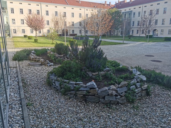 - Diversitätsförderung und Artenschutz (Hochbeete, Kräuterspiralen, Blumenwiese, Bau eines Insektenhotels)