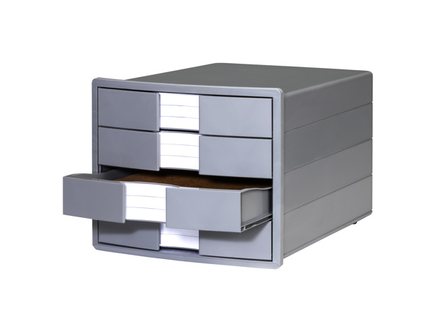 Schubladenbox IMPULS KARMA mit 4 geschlossenen, großzügigen Schubladen für Papierformate DIN A4/C4. Innovatives, attraktives Design in höchster Qualität. Für das HAN KARMA-Programm werden Post Consumer Materialien (bereits benutzte Kunststoffprodukte) verarbeitet. Inklusive großer auswechselbarer Beschriftungsschilder mit hochwertiger Klarsichtabdeckung für ein einfaches Auffinden von Unterlagen. Leichtlaufende Schubladen mit Auszugssperre und durchgängig geschlossenem Boden auch zur Kleinteile Organisation geeignet. Extra stabiles Gehäuse aus einem Stück gefertigt mit patentierter Stapeltechnik. Rutschfeste, möbelschonende Gummifüße sorgen für einen sicheren Stand. Made in Germany. Außenmaße (B x T x H): 280 x 367 x 235 mm. Innenmaße der Schubladen (B x T x H): 240 x 325 x 37 mm, daher ein hohes Fassungsvolumen. Material: 80-100% Recyclingmaterial, PS. Farbe des Gehäuses: öko-grau. Farbe der Schubladen: öko-grau.