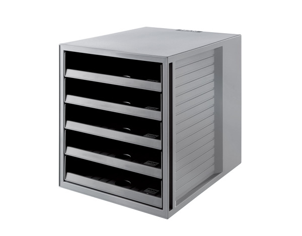 Schubladenbox SYSTEMBOX KARMA mit 5 geschlossenen Schubladen für Papierformat DIN A4 und größer. Für das HAN KARMA-Programm werden Post Consumer Materialien (bereits benutzte Kunststoffprodukte) verarbeitet. Ausgezeichnet mit dem Umweltzertifikat: DER BLAUE ENGEL. Innovatives, attraktives Design in höchster Qualität. Leichtlaufende Schubladen mit Auszugssperre und Griffloch für ein bequemes Entnehmen. Außenhöhe und -tiefe sind abgestimmt auf Ordnerhöhe bzw. auf ein Ordnerfach, somit ideal geeignet für den Schrankeinsatz. Extra stabile Verarbeitung. Stapelbar, dadurch Platz sparend. Made in Germany. Außenmaße (B x T x H): 275 x 330 x 320 mm. Innenmaße der Schubladen (B x T x H): 238 x 305 x 45 mm, daher ein hohes Fassungsvolumen. Material: 100% Recyclingmaterial. Farbe des Gehäuses: öko-grau. Farbe der Schubladen: öko-grau.