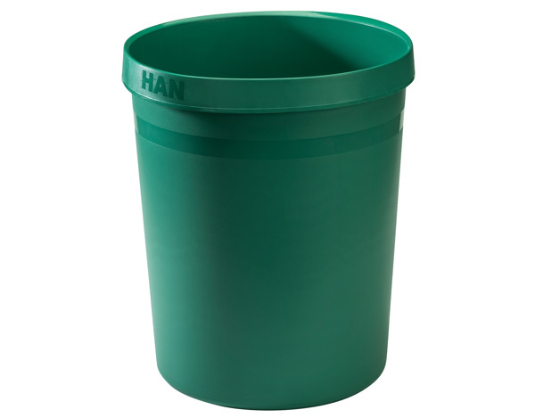 Papierkorb GRIP KARMA, 18 Liter. Der klassische Papierkorb in zeitgemäßem Design. Für das HAN KARMA-Programm werden Post Consumer Materialien (bereits benutzte Kunststoffprodukte) verarbeitet. Der umlaufende ergonomische Griffrand mit 2 praktischen Griffmulden sorgt für ein einfaches Tragen und sicheres Anbringen von Müllsäcken. Ideal für Büro und Privatbereich. Standfest und stabil. Die seidenmatte Außenoberfläche gilt als unempfindlich gegen Schmutzeinwirkungen. Dank der glatten Innenoberfläche ist der Papierkorb besonders reinigungsfreundlich. Fassungsvermögen: 18 Liter. Made in Germany. Durchmesser (O x U x H): 312 x 237 x 350 mm. Material: 80-100%. Recyclingmaterial. Farbe: öko-grün.