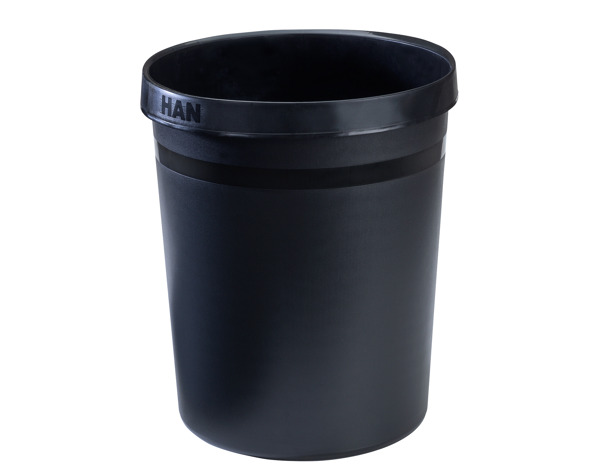 Papierkorb GRIP KARMA, 18 Liter. Der klassische Papierkorb in zeitgemäßem Design. Für das HAN KARMA-Programm werden Post Consumer Materialien (bereits benutzte Kunststoffprodukte) verarbeitet. Ausgezeichnet mit dem Umweltzertifikat: DER BLAUE ENGEL. Der umlaufende ergonomische Griffrand mit 2 praktischen Griffmulden sorgt für ein einfaches Tragen und sicheres Anbringen von Müllsäcken. Ideal für Büro und Privatbereich. Standfest und stabil. Die seidenmatte Außenoberfläche gilt als unempfindlich gegen Schmutzeinwirkungen. Dank der glatten Innenoberfläche ist der Papierkorb besonders reinigungsfreundlich. Fassungsvermögen: 18 Liter. Made in Germany. Durchmesser (O x U x H): 312 x 237 x 350 mm. Material: 80-100% Recyclingmaterial. Farbe: öko-schwarz.