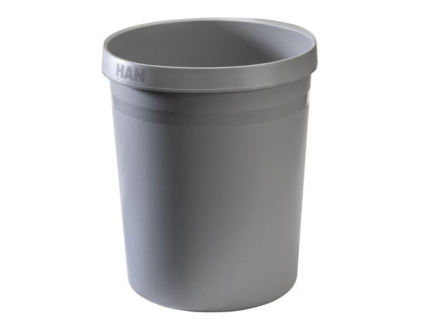 Papierkorb GRIP KARMA, 18 Liter. Der klassische Papierkorb in zeitgemäßem Design. Für das HAN KARMA-Programm werden Post Consumer Materialien (bereits benutzte Kunststoffprodukte) verarbeitet. Ausgezeichnet mit dem Umweltzertifikat: DER BLAUE ENGEL. Der umlaufende ergonomische Griffrand mit 2 praktischen Griffmulden sorgt für ein einfaches Tragen und sicheres Anbringen von Müllsäcken. Ideal für Büro und Privatbereich. Standfest und stabil. Die seidenmatte Außenoberfläche gilt als unempfindlich gegen Schmutzeinwirkungen. Dank der glatten Innenoberfläche ist der Papierkorb besonders reinigungsfreundlich. Fassungsvermögen: 18 Liter. Made in Germany. Durchmesser (O x U x H): 312 x 237 x 350 mm. Material: 80-100% Recyclingmaterial. Farbe: öko-dunkelgrau.