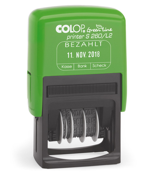 Der Printer S 260 L Green Line ist ein typischer Bürostempel mit Datum und nützlichem vordefinierten Text überwiegend aus Recyclingkunststoff hergestellt.