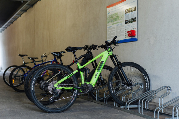 Gesicherte Fahrradgarage inklusive Ladestationen für E-Bikes zur Förderung der umweltfreundlichen Mobilität, insbesondere für Radreisende.
