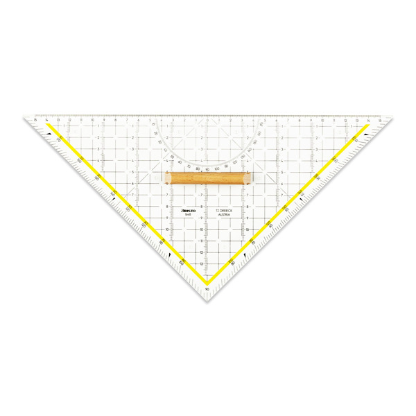Das gleichschenklige 45°-Dreieck 4519 mit einer Hypotenuse von 269 mm wird aus glasklarem Plexiglas® in Österreich gefertigt. Dieses maßbeständige Material und die abriebfeste Tiefprägung garantieren die einzigartige Spitzenqualität. Die Millimeterteilung von 190 mm wird immer auf die Kathete geprägt, dabei befindet sich der 0-Punkt an der Kante des 90° Winkels.