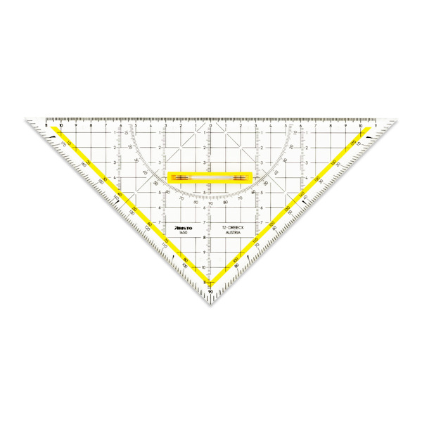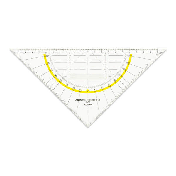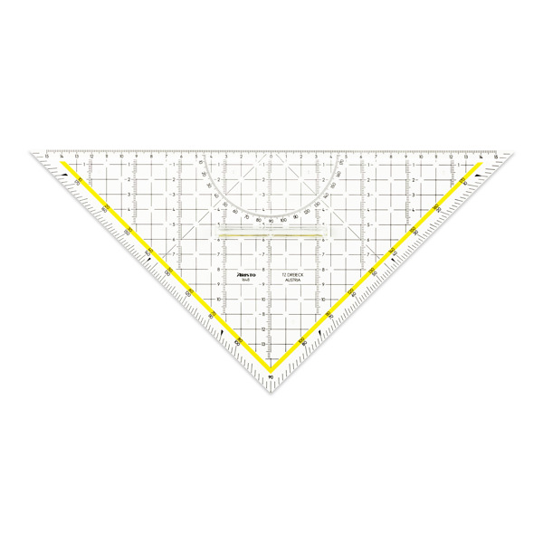 Das gleichschenklige 45°-Dreieck 4519F mit einer Hypotenuse von 269 mm verfügt über Facetten zur genauen Strichführung an allen drei Seiten. Die ARISTO 45°-Dreiecke werden aus glasklarem Plexiglas® in Österreich gefertigt. Dieses maßbeständige Material und die abriebfeste Tiefprägung garantieren die einzigartige Spitzenqualität. Die Millimeterteilung von 190 mm wird immer auf die Kathete geprägt, dabei befindet sich der 0-Punkt an der Kante des 90° Winkels.