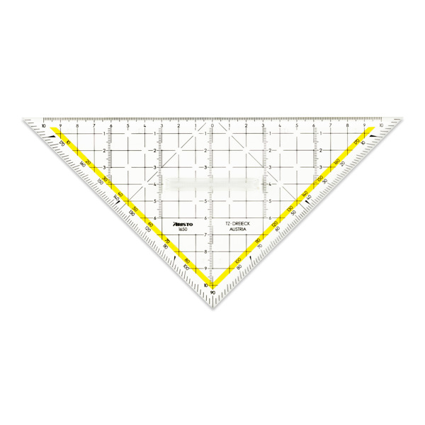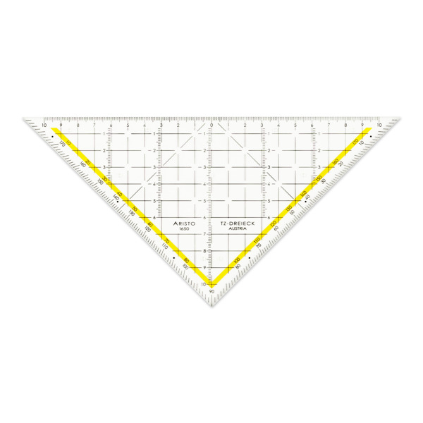 Das TZ-Dreieck 1648 mit einer Hypotenuse von 32,5 cm verfügt über einen Griff und eine Facette zur genauen Strichführung an der Millimeter-Skalierung. Die Tuschenoppen bilden einen Abstand zwischen TZ-Dreieck und Untergrund, um das Verwischen der Linien zu verhindern und die Teilung zu schonen. ARISTO TZ-Dreiecke werden aus glasklarem Plexiglas® in Österreich gefertigt. Dieses maßbeständige Material und die abriebfeste Tiefprägung garantieren die einzigartige Spitzenqualität. Kennzeichen von TZ-Dreiecken sind das 10 mm Gitternetz, Millimeter-Teilungen senkrecht zur Hypotenuse, markierte Winkel in 7° und 42° für perspektivisches Zeichnen, in 75° für Schrägbeschriftung und 45° Linien für leichteres Schraffieren. Die gelb hinterlegte Winkelskala ist ein Erkennungsmerkmal der ARISTO Geo- und TZ-Familie, Teilung und Beschriftung entsprechen der Ö-Norm.